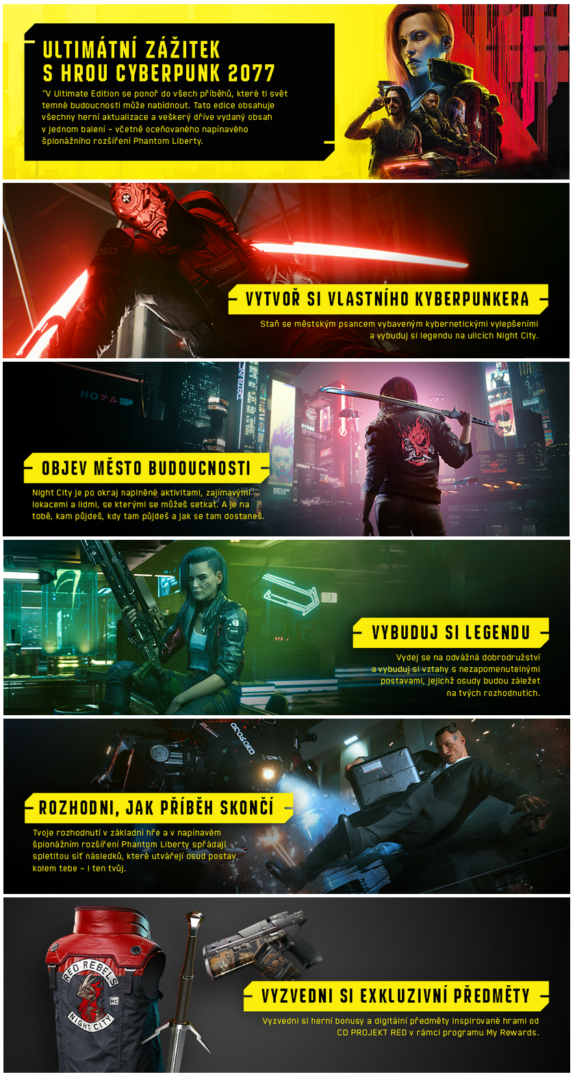Ultimate Edition obsahuje:Hru.Sadu samolepiek s potlačou.Prístup k digitálnym bonusom My Rewards. Bonus k predobjednávke:Bandana.Tlačený fan plagát.5 tlačených litografií. Cyberpunk 2077 je akčná dobrodružná RPG hra od..